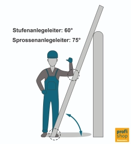 Bei der Ermittlung der nötigen Stand- und Arbeitshöhe ist ausserdem der Anstellwinkel der Anlegeleiter zu berücksichtigen. Der optimale Anstellwinkel beträgt 60° bei einer Stufenanlegeleiter und 75° bei einer Sprossenanlegeleiter. Auf diese Weise ist die optimale Rutschsicherheit für die Anstellleiter gewährleistet.