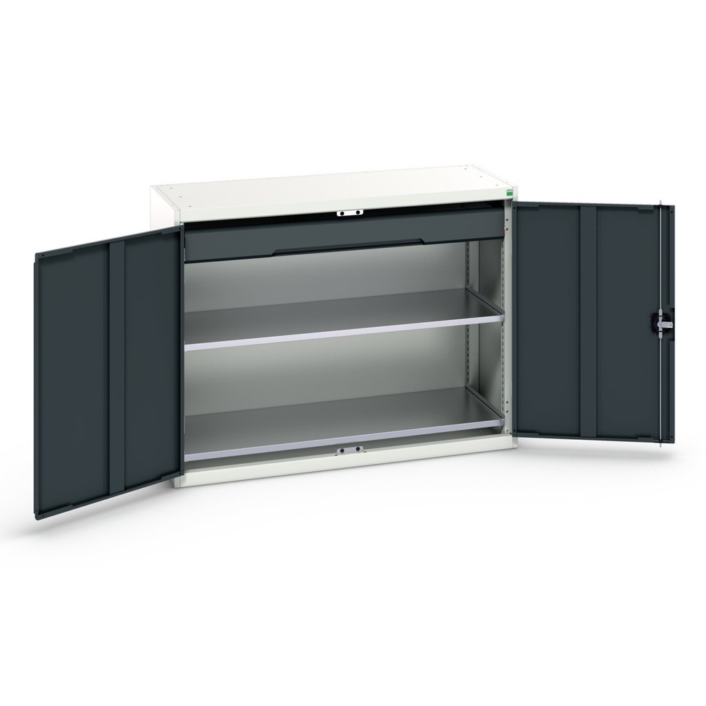 Der bott verso Beistellschrank mit Schublade besteht aus einem vollverschweissten Stahlblechgehäuse. Diese Konstruktion sorgt für eine hohe Standfestigkeit und lange Lebensdauer – selbst bei täglicher Beanspruchung. 2 verstärkte Türen schliessen bündig und sichern den Innenraum zuverlässig.