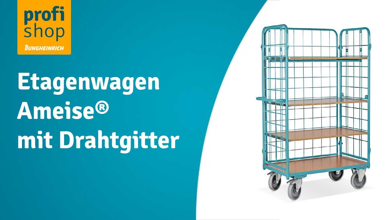 Der Etagenwagen Ameise® mit Drahtgitter an 3 Seiten ist für einfache Transportaufgaben hervorragend geeignet. Die praktischen Gitter des Wagens sichern die Ladegüter während der Fahrt vor dem Herausfallen.