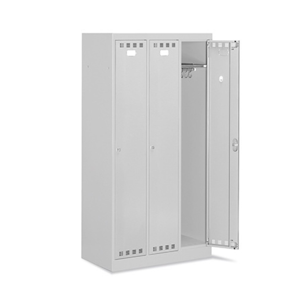 Jeder Spind ist mit einem verzinkten Boden und einer Kleiderstange ausgestattet. Je nach Variante sind auch Polypropylen-Füsse für zusätzliche Stabilität und ein praktisches, schmutzabweisendes Schrägdach erhältlich.