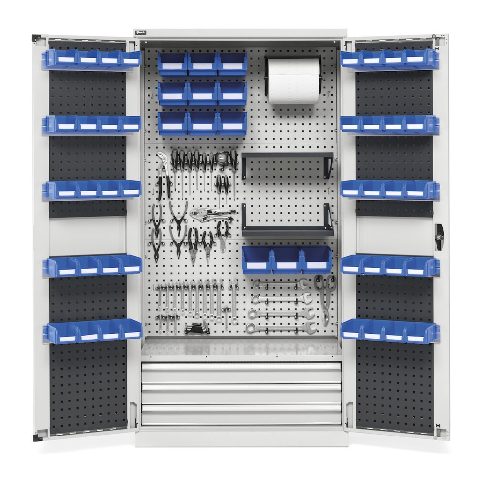 Der Schrank ist mit einem Set aus Rollenhalter und Papierrolle (Ø 240/300 mm) ausgestattet. 4 Packungen mit je 30 Haken Unipok sowie 10 Halterungsschienen mit insgesamt 40 Picking Boxen in Grösse 1 und 4 Halterungsschienen mit 12 Picking Boxen in Grösse 2 bieten umfangreiche Möglichkeiten zur individuellen Organisation Ihrer Werkzeuge und Materialien.