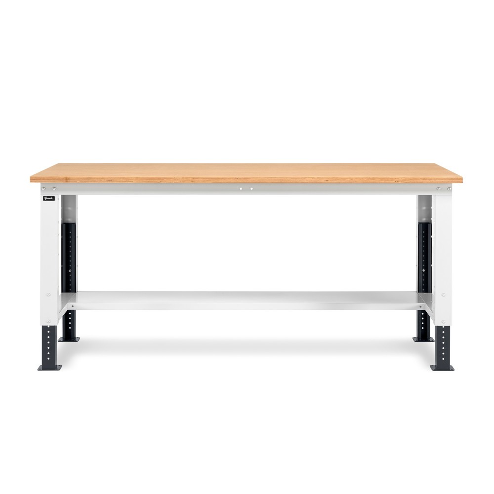 Robuste Arbeitsfläche mit höhenverstellbarer Funktion: Die tragkräftige Fami Werkbank mit Multiplexplatte in 30 mm Stärke bietet eine tragkräftige Fläche für Arbeiten an schweren Werkstücken. In zahlreichen Ausführungen mit unterschiedlicher Farbgebung und Abmessung erhältlich.