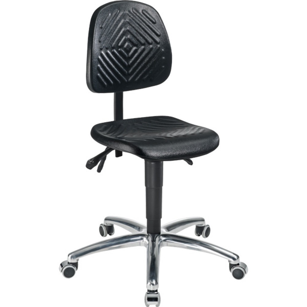 Sitz und Rücken sind aus robustem, leicht zu reinigendem PU-Schaum gefertigt. Den Arbeitsdrehstuhl Chrom II gibt es wahlweise mit Rollen für mehr Mobilität oder mit Bodengleitern für einen möglichst stabilen Stand.