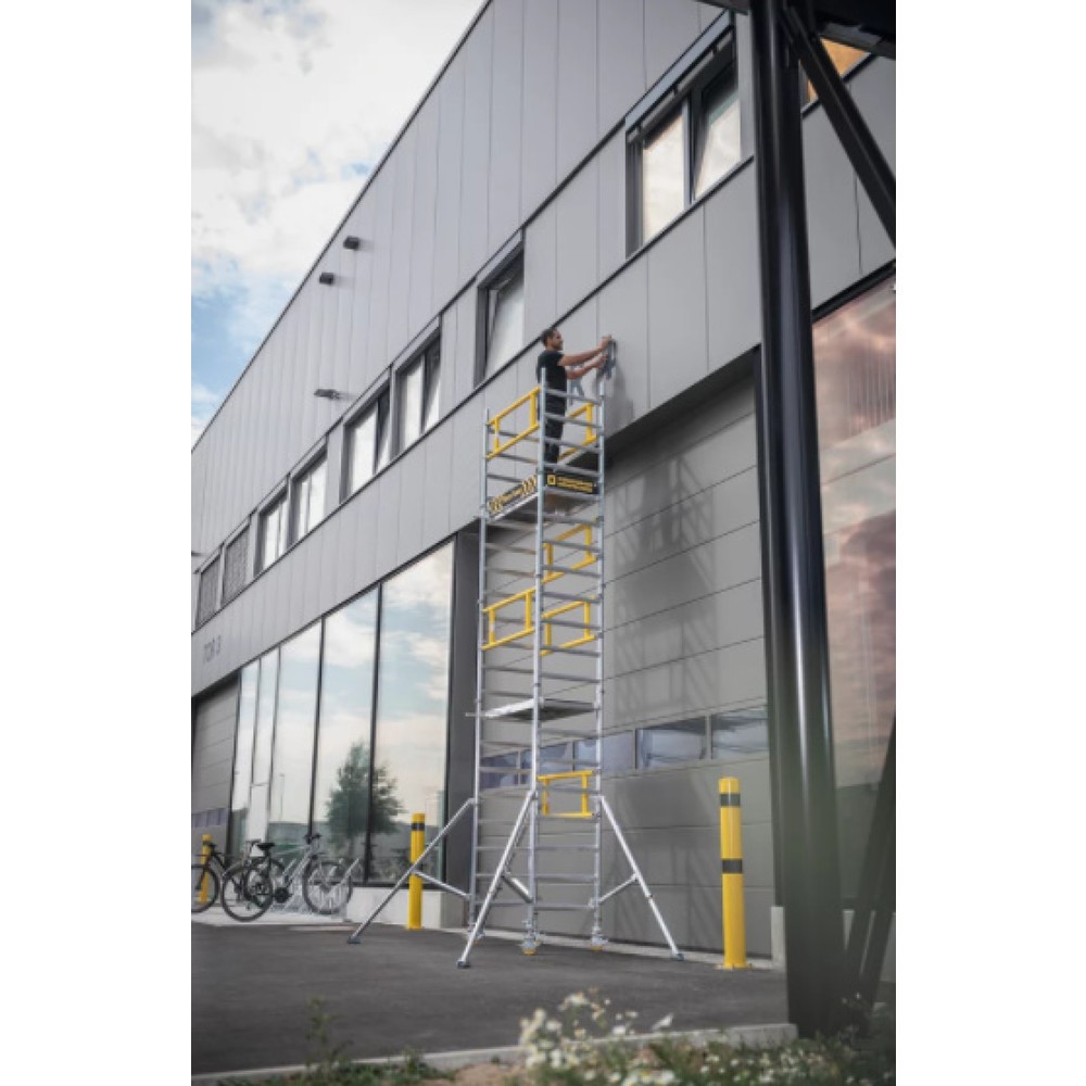 Bauen Sie das Gerüst je nach Arbeitseinsatz flexibel bis zu einer Arbeitshöhe von 6,10 m auf. Dank seiner flexiblen und stabilen Bauart mit Dreiecksausleger und Schwenkfuss überzeugt das Flexxtower Ein-Personen-Gerüst in jeder Situation. Selbst beim Verfahren des Gerüsts in engen Gängen ermöglichen die integrierten Lenkrollen ein bequemes Manövrieren. Beim Abtransport und der Lagerung des Gerüsts profitieren Sie zudem von den platzsparend ineinander stapelbaren Bauteilen.
