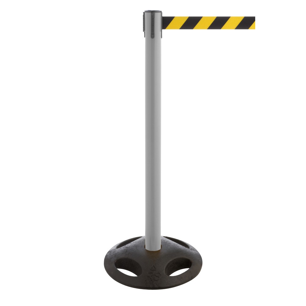 RS-GUIDESYSTEMS® Gurt-Absperrpfosten, Bodenteller aus Verbundwerkstoff, Gurtbreite 50 mm, grau, schwarz / gelb diagonal gestreift