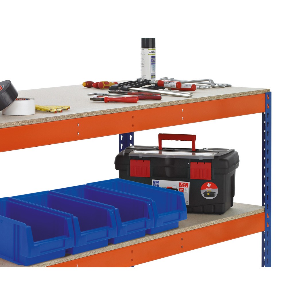 Der Werktisch bietet eine solide Grundlage für handwerkliche Arbeiten im Betrieb. Dank höhenverstellbarer Spanplatten können Sie diesen robusten Werktisch nach Ihren Anforderungen individuell anpassen. Per Steckystem lässt sich der Tisch einfach und schnell montieren.