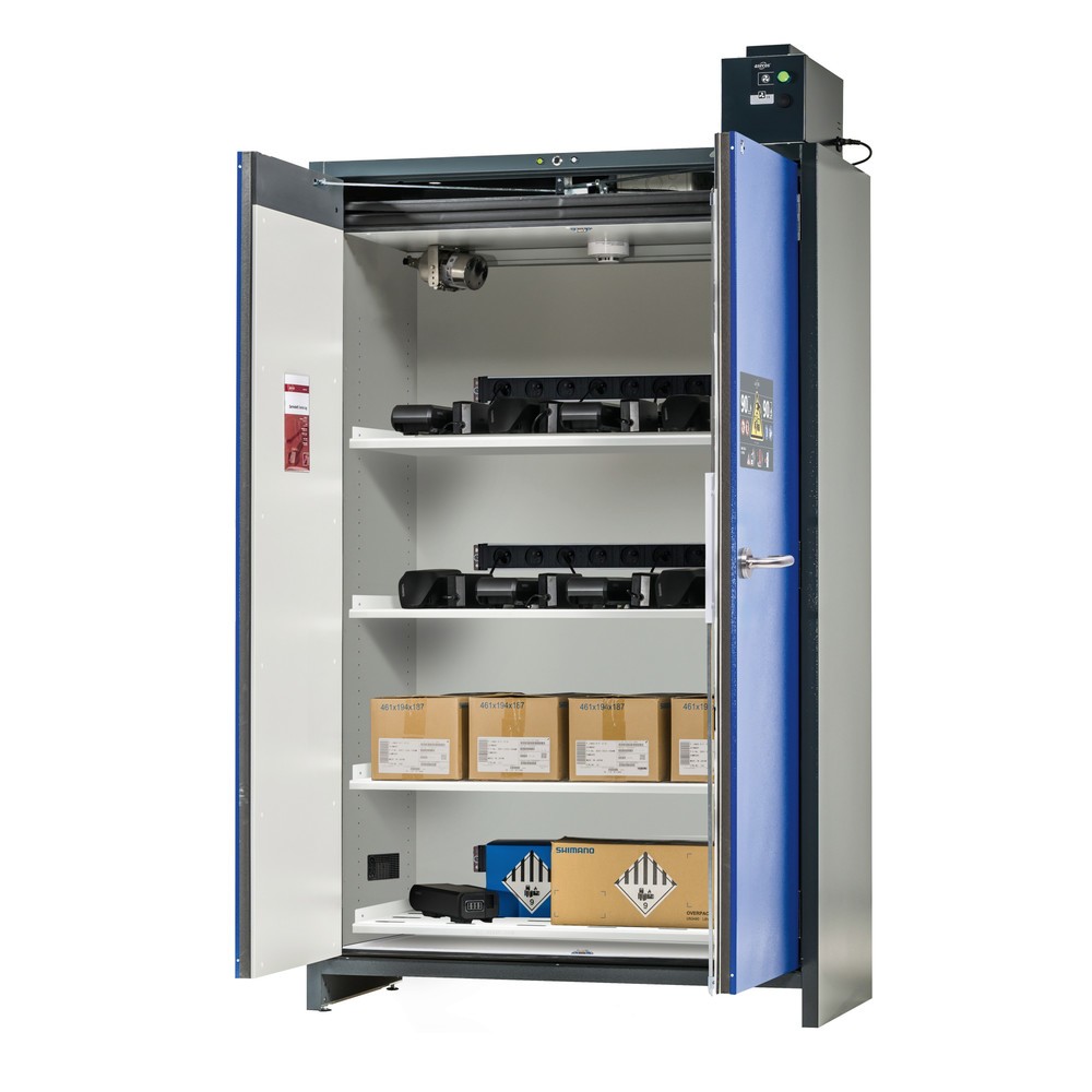 Jeder Akku-Sicherheitsschrank aus unserem Sortiment verfügt daher über einen Korpus mit hoher mechanischer Beständigkeit, feuerfester Ausstattung und geprüfter Brandlastdämmung. Das bedeutet zum einen, dass Akkus vor einem Feuer ausserhalb des Lithium-Ionen-Schranks geschützt sind. Die Brandschutzeinrichtungen der Aufbewahrungseinheit sind zum anderen dazu geeignet, einen im Innern des Schranks ausbrechenden Akku-Brand zu isolieren und ein Ausbreiten des Feuers zu verhindern.