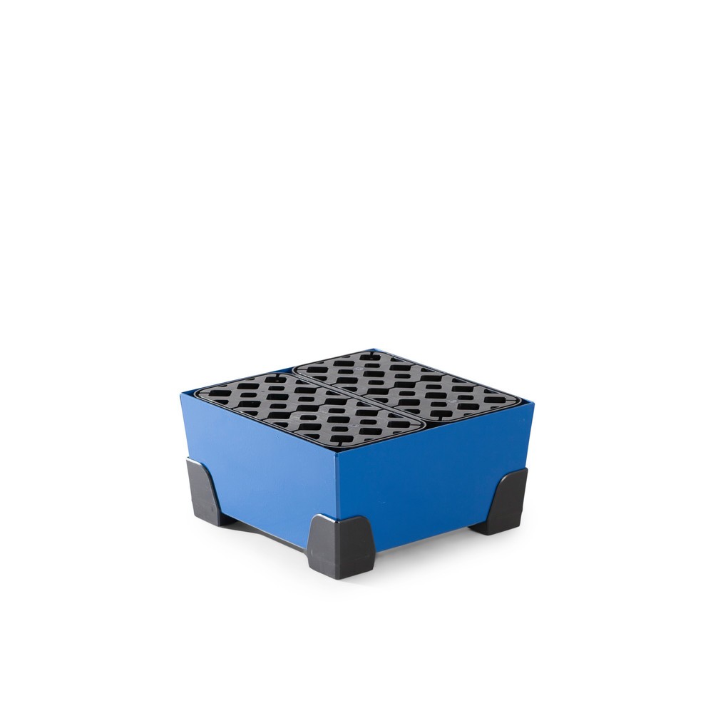 Le bac de rétention pour petits contenants en acier, d’une hauteur de 200 mm est disponible à la livraison dans différentes tailles, avec grille en PE ou tôle perforée galvanisée comme surface de pose.