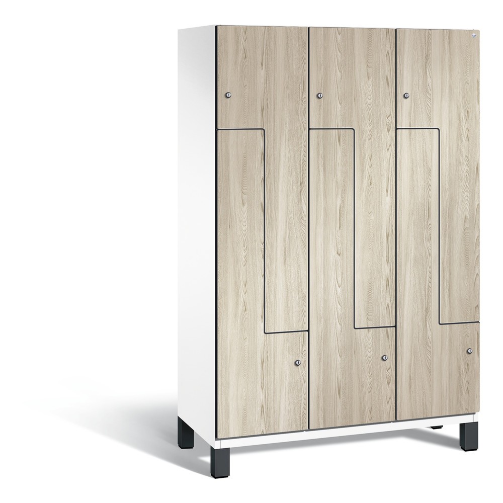 Casier Z C+P Cambio, 3 compartiments, largeur de casier 400 mm, haut. x larg. x prof. 1 980 x 1 200 x 525 mm, RAL 9016 blanc signalisation, décor frêne Sen, pieds