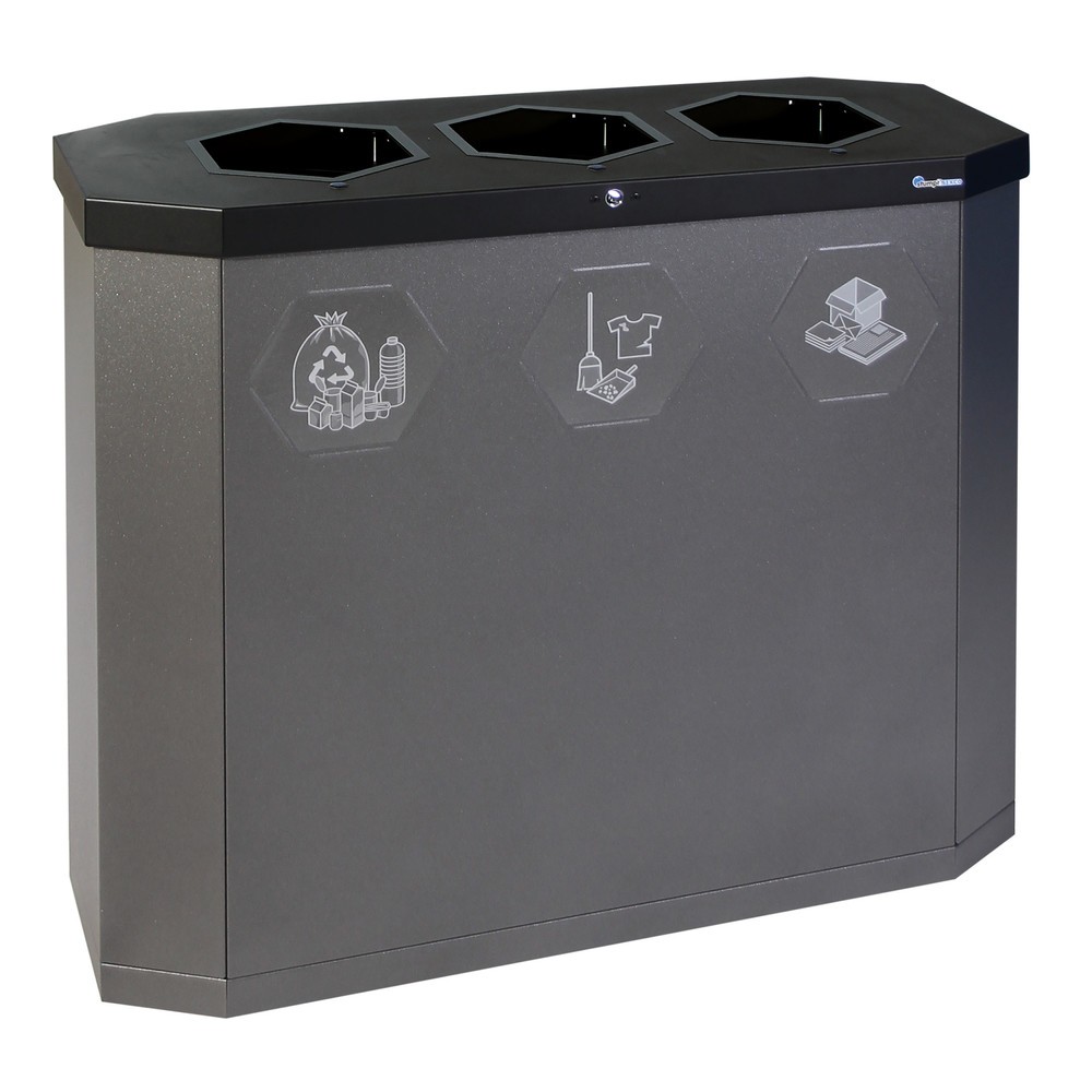 Ouverture sans clapet pour plus de confort : dans le conteneur à déchets ouvert stumpf® Sixco 3 smart, les déchets comme le papier peuvent être éliminés rapidement. Outre ses ouvertures libres, ce conteneur moderne se distingue par sa forme hexagonale en nid d'abeille. Fabriqué en acier galvanisé de qualité, le Sixco 3 Smart offre une contenance de 3 x 45 l.
