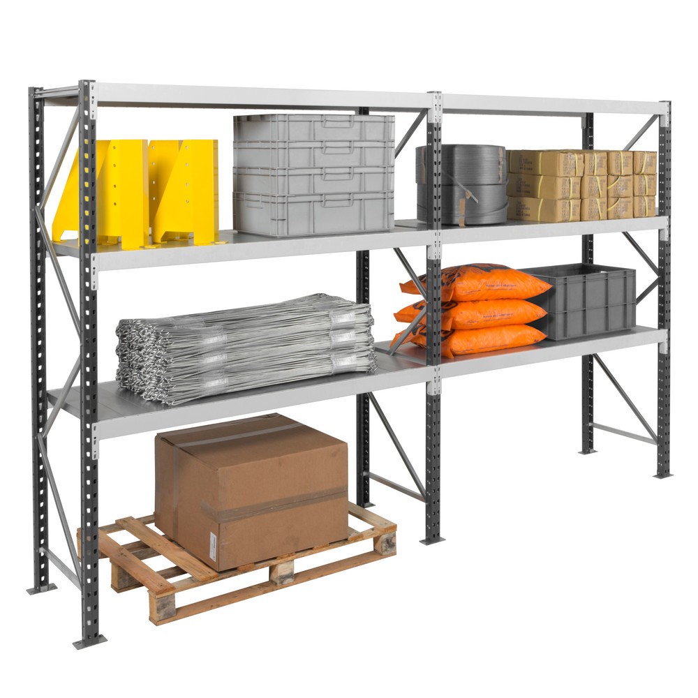 Mettez plus d’ordre dans l’entreposage de vos produits encombrants : commandez le rayonnage grande portée bilatéral avec panneaux d’acier en tant que travée de base ici chez nous.