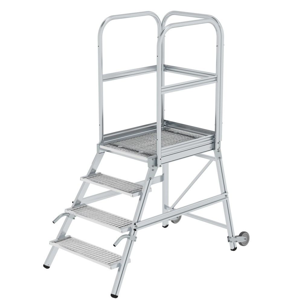 Munk Escalier à plate-forme, avec marches d’un seul côté, roulettes et poignées, en caillebotis acier, 4 marches