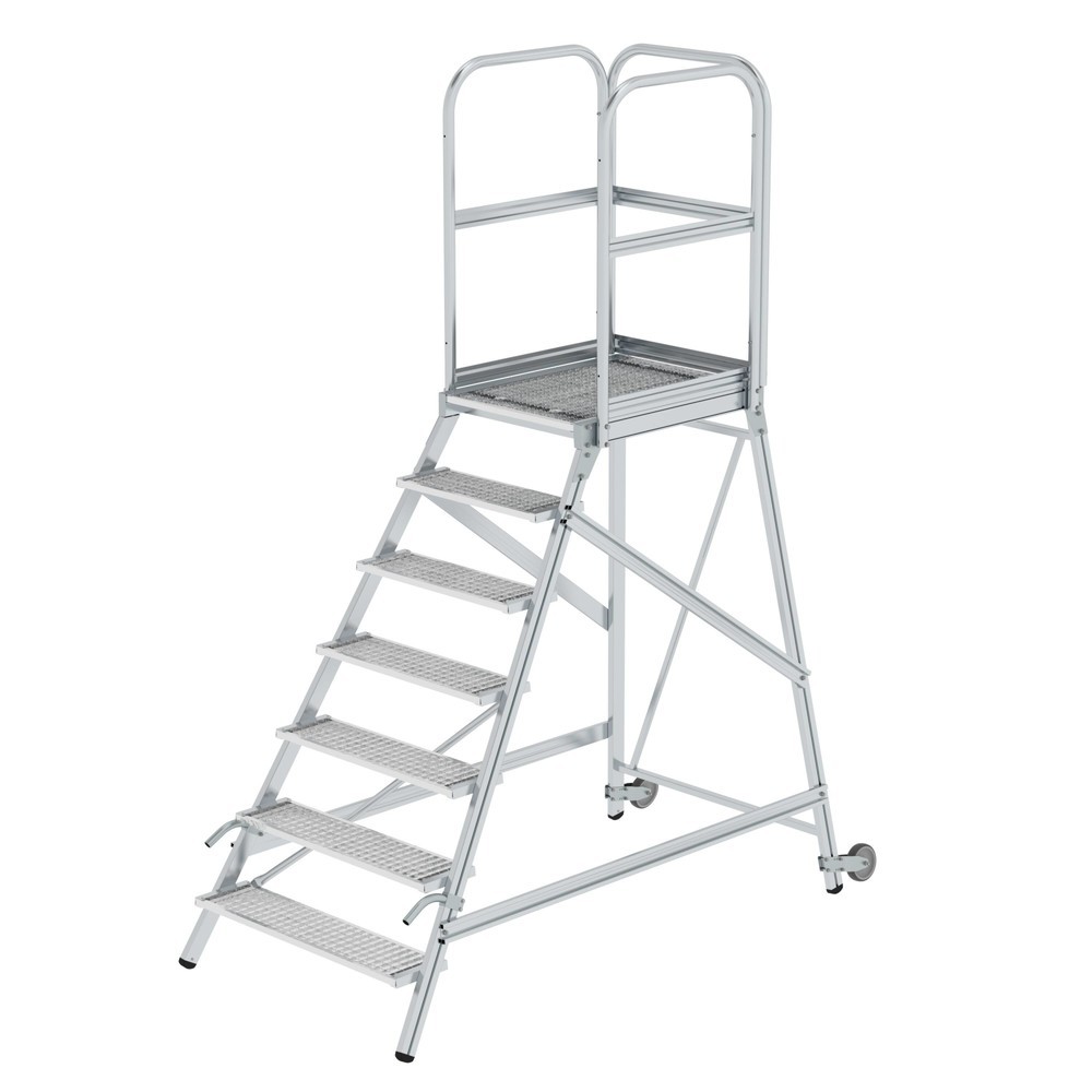 Munk Escalier à plate-forme, avec marches d’un seul côté, roulettes et poignées, en caillebotis acier, 7 marches