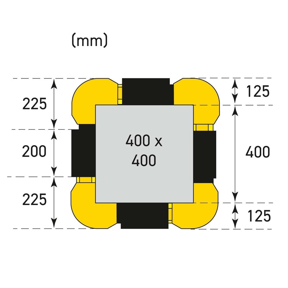 La protection de colonnes est constituée de 4 éléments distincts qui s’emboîtent les uns dans les autres. Ce qui permet de couvrir tous les diamètres intérieurs carrés compris entre 200 x 200 mm et 300 mm x 300, y compris les grandeurs rectangulaires telles que 200 x 300 mm.
