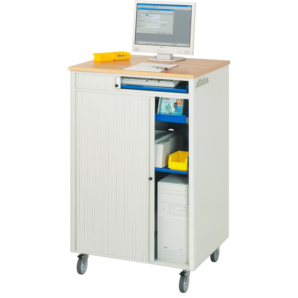 RAU Postes informatiques HxlxP 1 100 x 720 x 660 mm, plateau de travail décor hêtre, avec volets roulants, bloc multiprises et jeu de roulettes