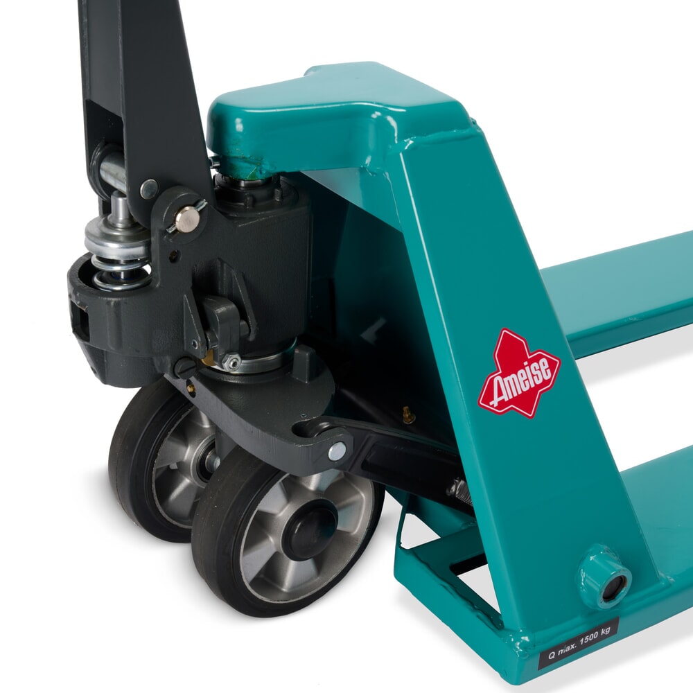 Avec une hauteur d'insertion de seulement 51 mm, le transpalette manuel surbaissé Ameise®, longueur des fourches 1 150 mm s’avère idéal pour le transport de palettes spéciales basses, de palettes plates ou de bobines spéciales. Profitez de la qualité Ameise® : le transpalette manuel avec 1 500 kg de capacité de charge est polyvalent et construit pour l’utilisation durable.